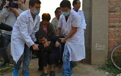 山东残联百千万远大脑科健康救助工程计划利用2014年至2018年的五年时间,将全额免费救助100名心理疾病患者、为1000名心理疾病住院治疗患者补贴2000元。病种包括:精神分裂症、失眠、躁狂症、抑郁症、癫痫、强迫症、帕金森症、重度癔症等。图为车卫众在医护人员的协助下走出门口,接受治疗。